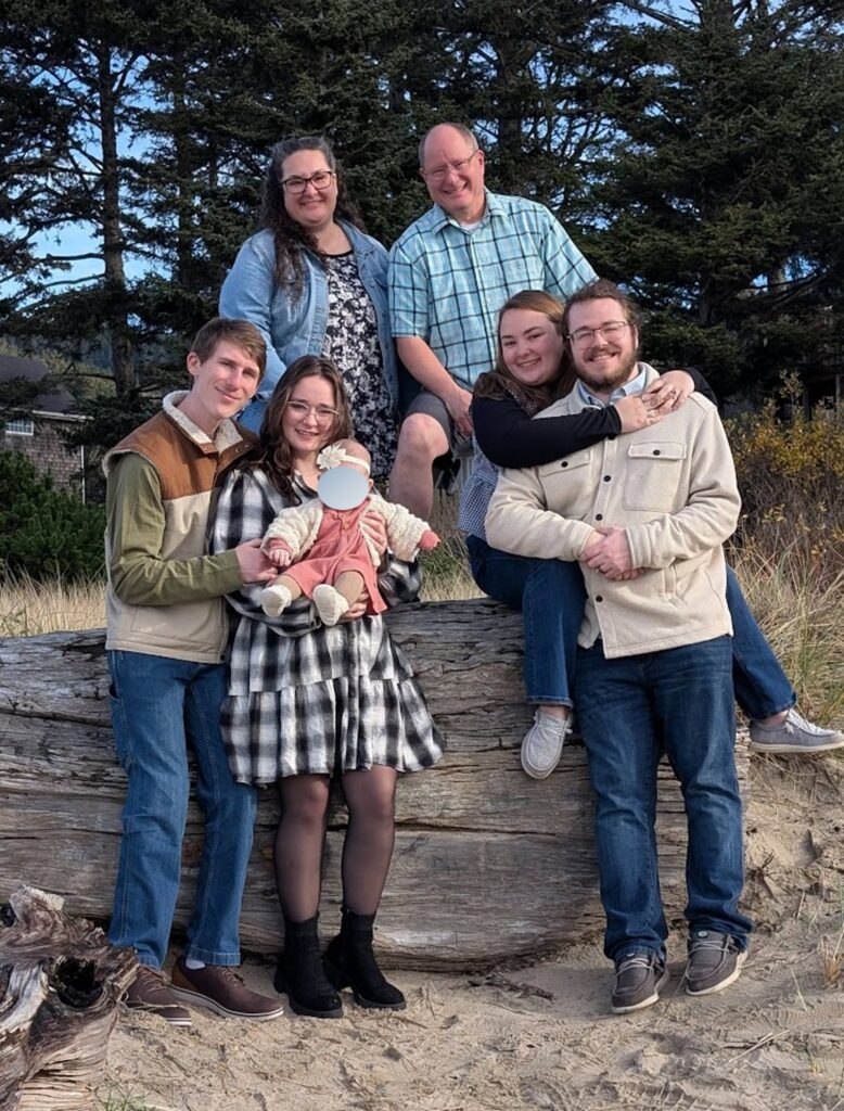 David’s family went to Cannon Beach to help Cyndee decorate the Conference Center. They posed for a family picture while they were there. Nathaniel, Joy and their daughter, Sam, David; Nicole and Colton.